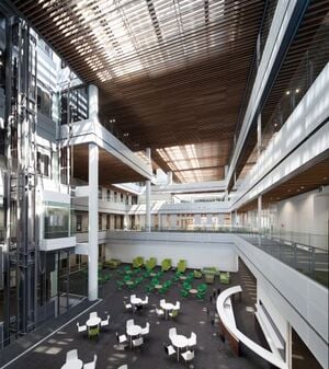 | Brief description of project | This mixed-use complex includes a library, a public health center and a community center. The building design enables seamless access to all of these facilities through a central, spacious, multifunctional garden. A sloping incline path rises from the garden, connecting with the second floor public library. The aim of this project was to create open, inviting promenade-like spaces where the linear building and the undulations of the garden complement one another. A combination of four dynamically curved surfaces with different slopes comprise the roof, allowing daylight and fresh mountain air to enter where the curved roof planes overlap. The roof structure made in the form of a catenary curve from standardized local timber, creates large-span, column-free interior activity spaces. |