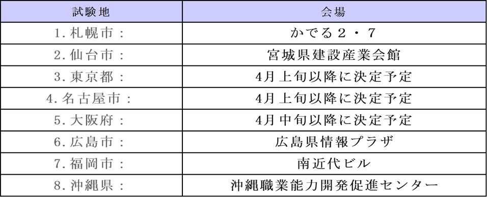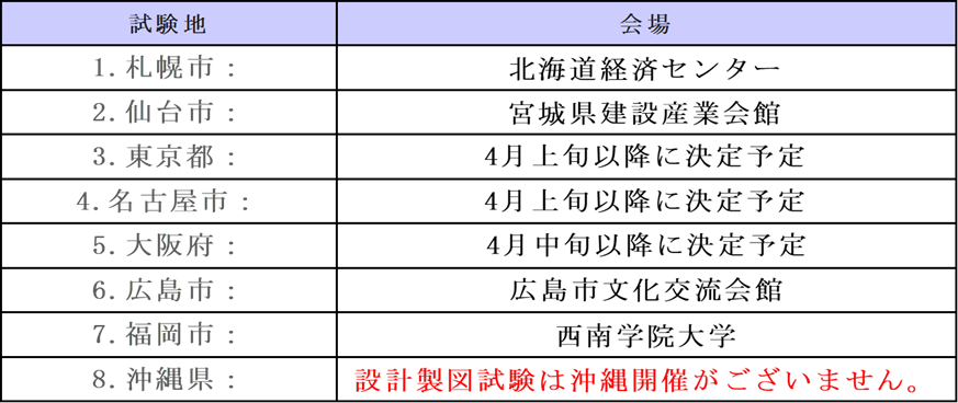 ・今年の建築設備士試験「設計製図試験」の会場は以下となります。