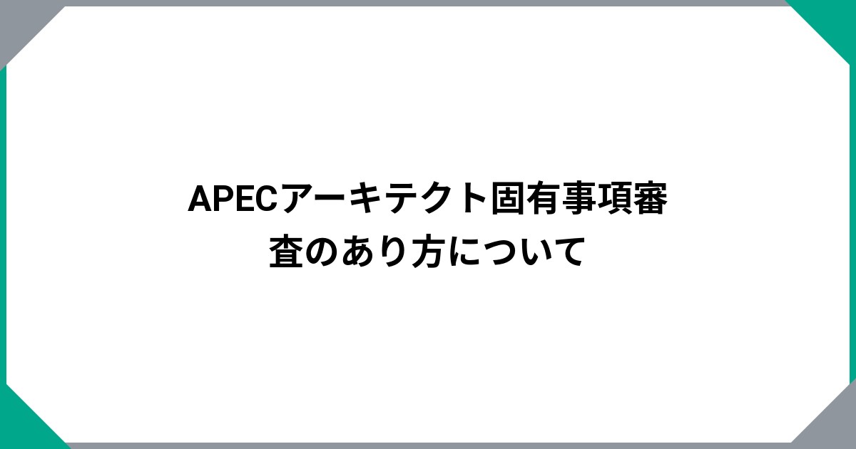- 固有事項審査を適用する者は、固有事項審査に基づく相互認証に合意したエコノミーのアーキテクト資格を有するAPECアーキテクトとすること。