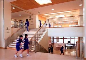 生徒の学習意欲に対応できる教育環境づくりとして、1階に「教科ユニット」、2階に「学年ユニット」、これらの階とスキップさせた中2階に「管理センター」と「ラーニングリソースセンター」を配置し、ユニットごとの連携をはじめとして、教育空間としての機能性と快適性を求めました。平成22年度日事連建築賞 国土交通大臣賞を受賞しました。 |